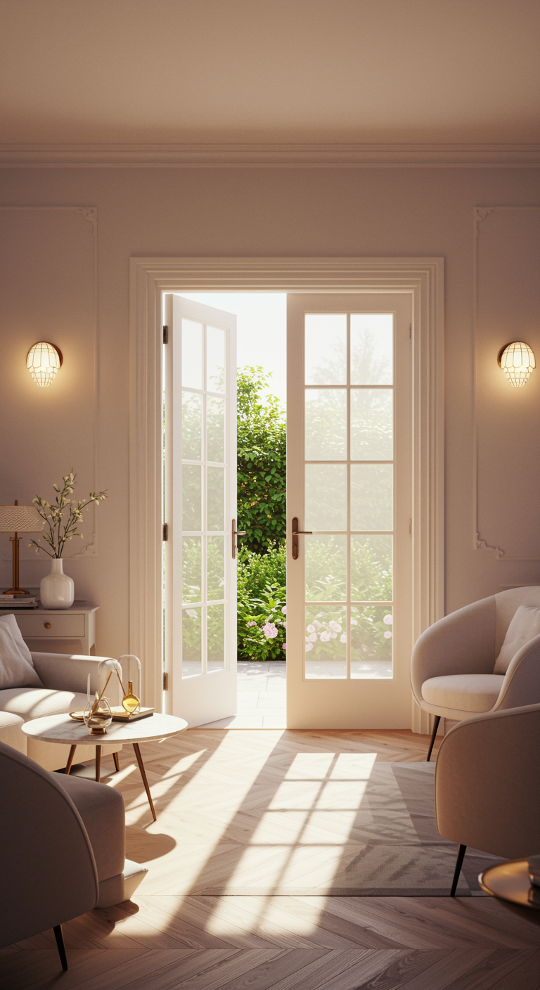 A serene digital rendering of a sun-drenched living room where AI meets elegance; sleek, minimalist furniture adorned with soft, pastel colors harmoniously complements the centerpiece: a pair of sophisticated interior French doors. These doors, crafted with both traditional charm and futuristic innovation, open into a lush virtual garden, letting in a cascade of digital sunlight. The doors, equipped with smart glass, adjust their opacity based on the virtual sunlight's intensity, casting playful patterns onto the room's wooden floors. Ethereal, ambient lighting emerges from creative AI-designed light fixtures, subtly altering the room’s mood as one ventures closer to the French doors, blending the warmth of classic design with cutting-edge technology.