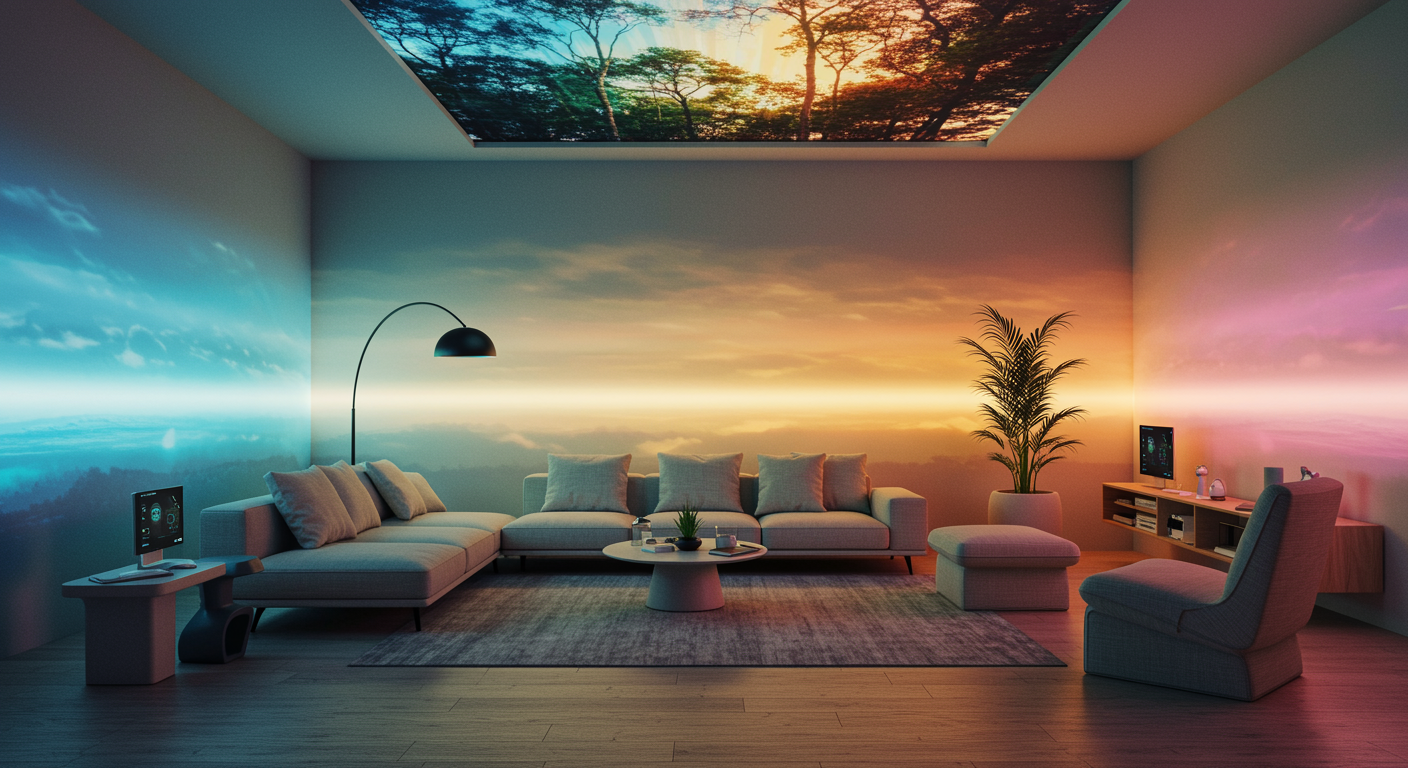 Imagine a futuristic living room where AI-driven technology seamlessly blends with organic elements: the walls, imbued with smart paint, dynamically shift colors from calming ocean blues to warm sunset hues in response to the time of day, the ceiling displays an ever-changing digital mural of a serene forest canopy, and furniture pieces—crafted from sustainable materials—are programmed to reconfigure themselves based on the user's mood, all set in a minimalist space where nature and technology merge in perfect harmony to redefine the concept of home interior painting.