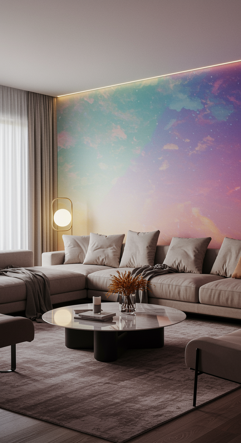 Imagine a futuristic living room designed by an AI with an ethereal palette of interior house paint that transforms with the time of day. In the morning, soft pastel hues gently awaken the senses, creating a serene ambiance. By afternoon, the colors shift to vibrant blues and greens that invigorate the space. As night falls, deep purples and rich golds emerge, casting an air of mystery and luxury. The walls themselves seem to breathe and interact, with patterns that subtly evolve, influenced by the occupants' moods and the weather outside. Sleek, intelligent furniture complements the dynamic color scheme, designed with sustainable materials that echo the natural world, blurring the line between indoors and outdoors in this visionary depiction of AI interior design.