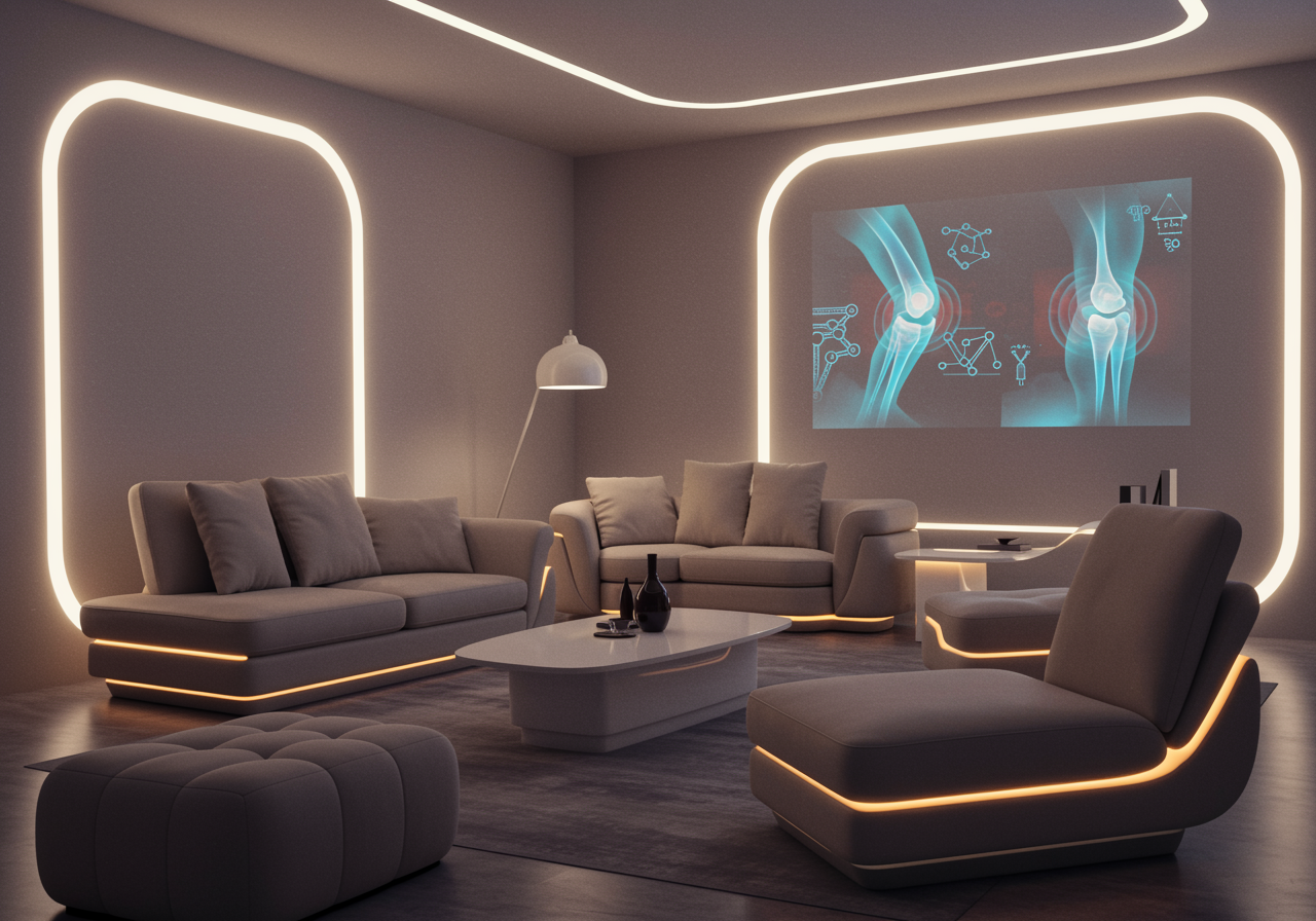 In a futuristic living room designed by AI, soft curves and organic shapes reminiscent of the human knee structure harmoniously blend into the interior aesthetic, with seamless joints of furniture that incorporate cushioned, flexible surfaces for maximum comfort and support. Holographic art depicting gentle knee movements adorns the walls, while ambient lighting shifts in soothing colors to alleviate the psychological experience of pain, creating an environment that feels both healing and ultra-modern.