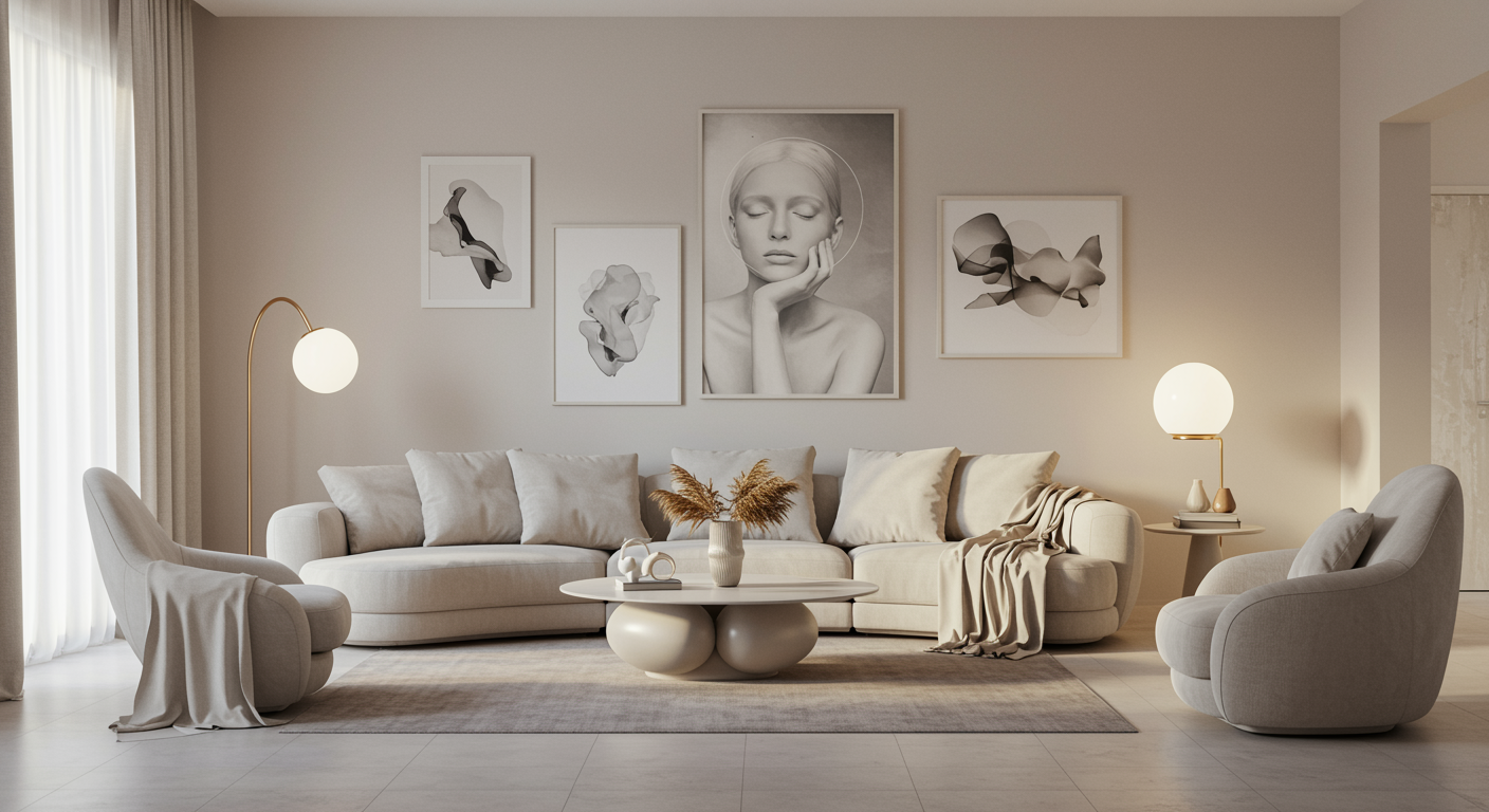 A serene living room where AI algorithms subtly weave elegance with comfort: a seamless blend of ultra-modern furniture, organically-shaped like whispers of conversation, harmoniously ethereal lighting casting shadows of thought, digital art displays that evolve in response to contemplative moods, and smart textiles draping the space, reacting to the emotional narrative of an invisible interior monologue.