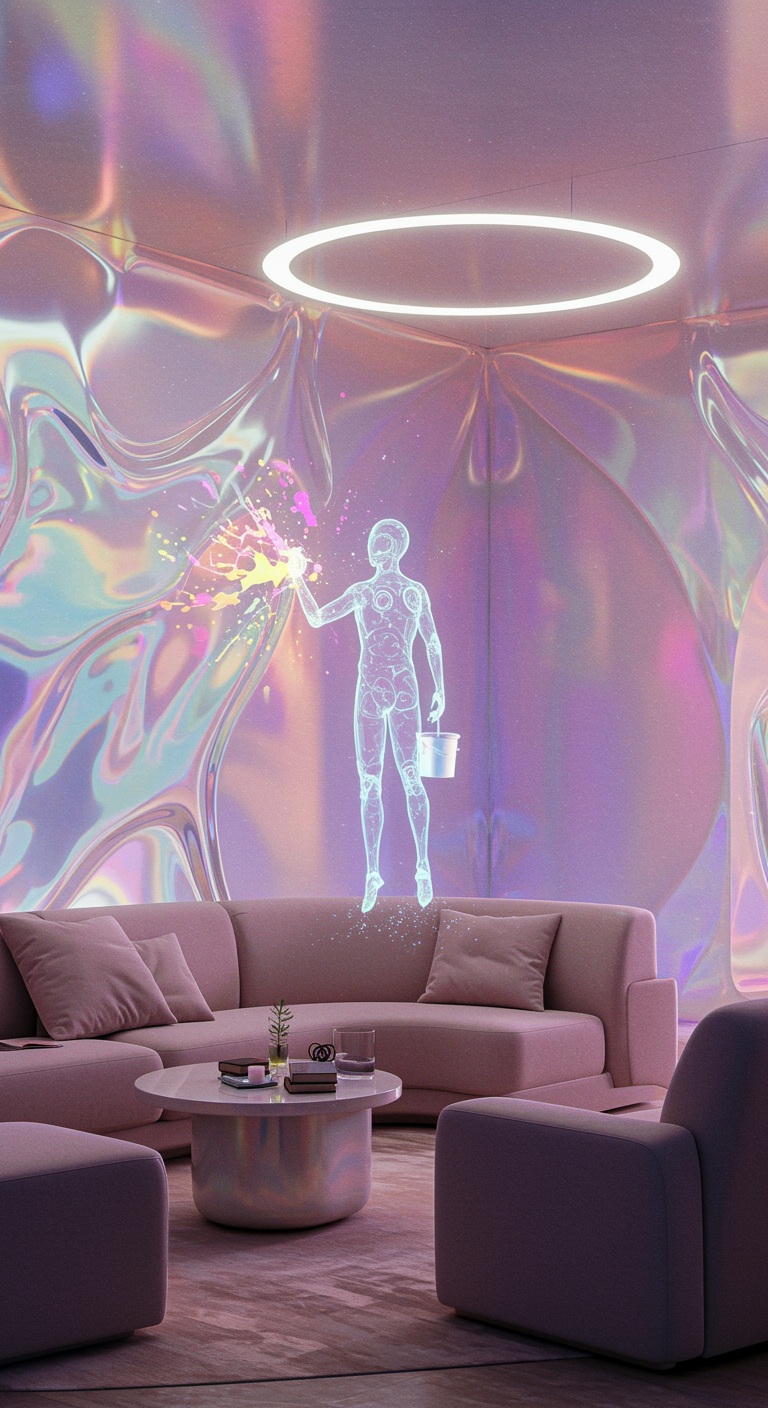 "Imagine a futuristic living room designed by AI, where sleek, iridescent surfaces blend seamlessly with organic, nature-inspired elements. In the foreground, an ethereal, holographic figure resembling an 'interior painter near me' is seen hovering, adding vibrant, dynamic splashes of color to the walls with a digital brush. The room is filled with smart furniture that adapts to your moods, ambient lighting that shifts in color and intensity, and virtual art installations that evolve throughout the day. This space captures the perfect harmony between technology and creativity, offering an immersive and interactive environment that redefines modern living."
