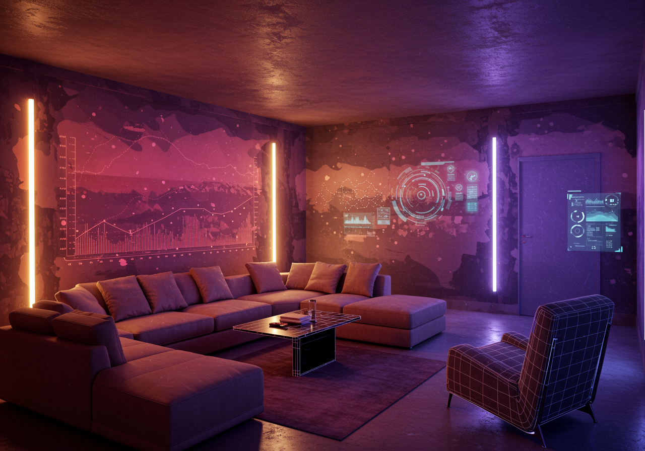 Envision a futuristic room where AI-driven technologies seamlessly blend with classic artistry, featuring an interior painting company’s touch. Imagine a spacious living area with walls that dynamically change colors based on mood, sunlight, and time of day, using AI algorithms to create an ever-evolving palette. The room is adorned with abstract murals that incorporate data patterns, and the furniture appears to be sculpted from digital blueprints, showcasing a synergy between human creativity and machine precision. A transparent digital interface is subtly integrated into the walls, allowing users to customize their environment with a mere gesture. The space is lit by smart LED lights that adjust their hues to complement the tones of the walls, creating a harmonious atmosphere that reflects the cutting-edge partnership between AI and interior artistry.
