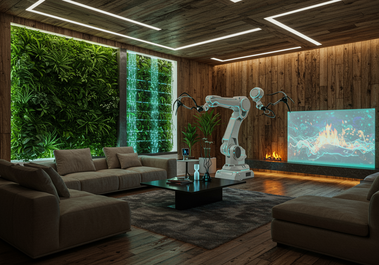 A futuristic living room transformed by AI interior design, where robotic arms seamlessly integrate reclaimed wood and bioluminescent materials into the walls, floor, and ceiling; a cascading vertical garden infused with smart technology that adjusts light and water flow to match the ambiance; and a holographic fireplace projecting soothing visuals that shift with the room's energy, all coming together to depict a harmonious blend of nature and technology in an innovative interior renovation.