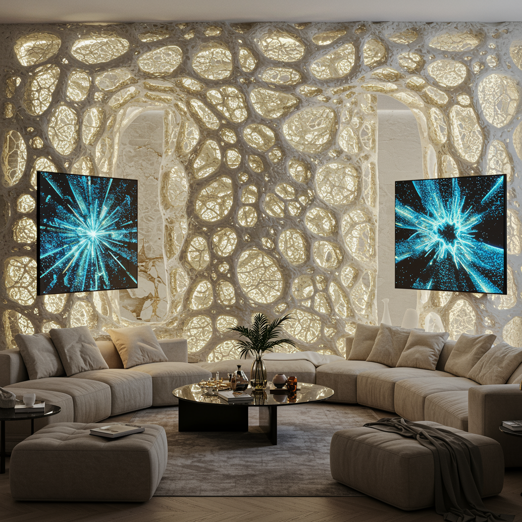 Imagine a futuristic living room where AI has seamlessly integrated into the fabric of interior design; the central focus is an innovative wall framing that resembles an intricate, organic lattice structure crafted entirely from intelligent materials. This cybernetic wall, alive with subtle pulses of ambient light, adjusts its patterns and textures dynamically in response to the room's moods and activities. It frames expansive digital canvases that display generative art, transforming the space into a symphony of form and function. The room is a harmonious blend of natural elements and advanced technology, showcasing a unique balance between human comfort and AI sophistication, encapsulating the epitome of futuristic interior design with an artistic twist.