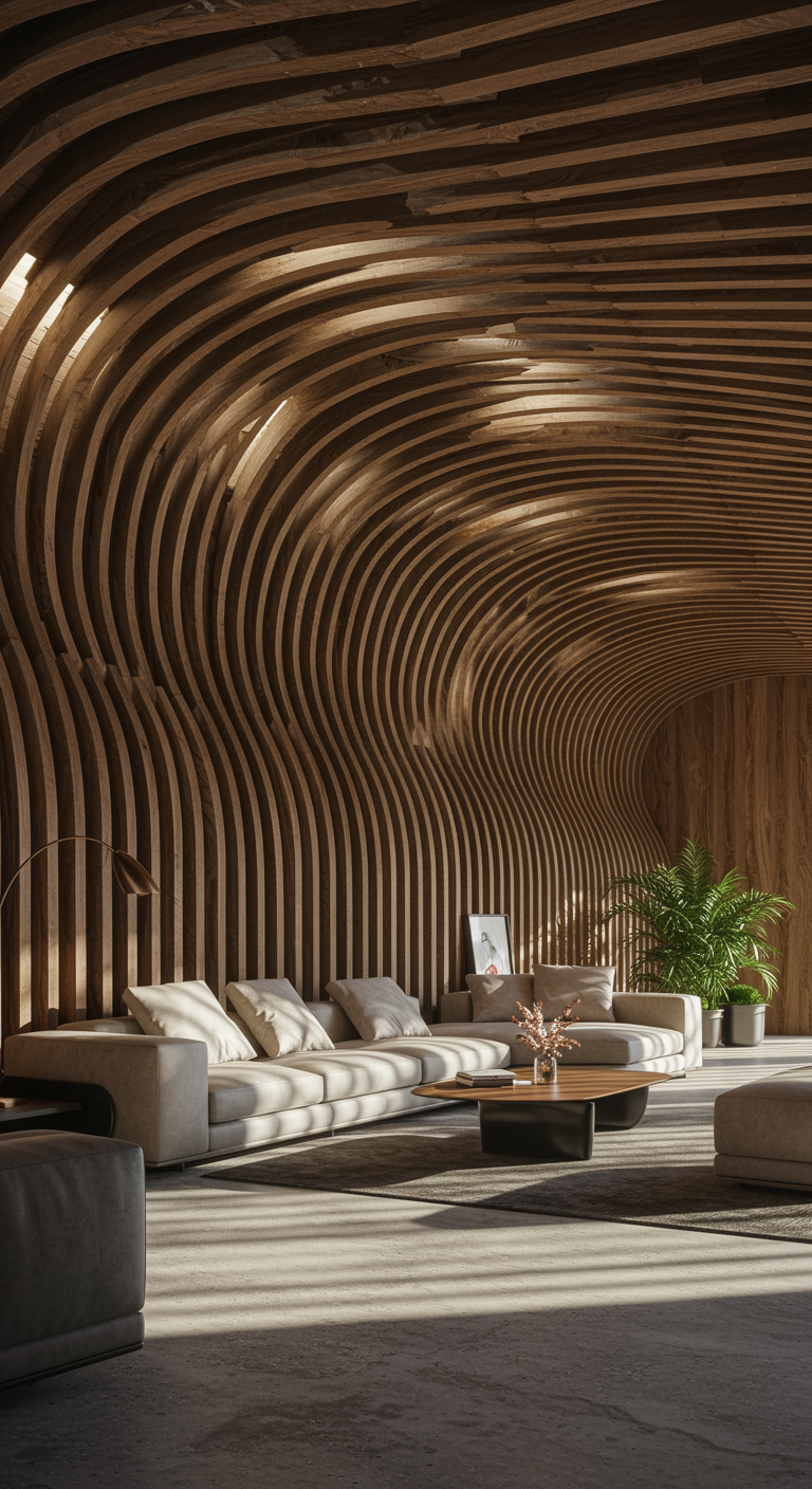 Imagine a futuristic living room where the walls are adorned with sleek, interlocking wood slats that seem to gently undulate like waves, an AI-created masterpiece. Sunlight filters through the gaps, casting an intricate dance of shadows on the polished concrete floor. The wood, exhibiting an array of earthy tones and dynamic textures, transforms the room into a tranquil sanctuary. Furniture pieces, designed with an organic yet modern flair, echo the natural patterns of the slats, creating a harmonious blend of technology and nature. Soft ambient lighting highlights the subtle curvature of the walls, as live plants create an invigorating burst of color amidst the warm, wooden embrace, symbolizing the perfect balance between innovative design and natural elements.