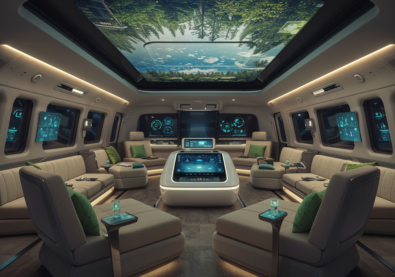 Imagine stepping into a futuristic lounge that seamlessly blends cutting-edge technology and luxurious comfort, inspired by the Kia Carnival 2025 interior. The space is bathed in ambient, customizable lighting that adapts to your mood, with smart surfaces and holographic displays that provide interactive information at your fingertips. Sleek, modular seating arrangements covered in eco-friendly materials are arranged around a central AI hub, which serves as the control center for the environment, adjusting temperature and soundscapes according to personal preferences. A panoramic digital sky roof displays changing vistas from serene forests to bustling cityscapes, enhancing the ambiance. This visionary space perfectly marries the essence of automotive innovation with the comforts of a high-tech domestic haven, offering a glimpse into the future of interior design.