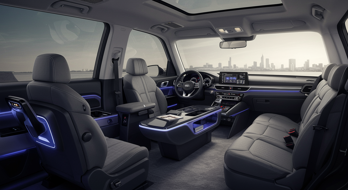 Envision a cutting-edge living space where futuristic design meets automotive elegance. The room is seamlessly inspired by the plush interior of a Kia Seltos, featuring sleek, ergonomic furniture that mirrors the car's modern aesthetic. Seats are upholstered in luxurious leather with detailed stitching, echoing the premium car seats, while ambient lighting adds a sophisticated glow reminiscent of a high-tech dashboard. A central control console emerges as a coffee table with integrated smart technology for effortless interaction. Large windows filter natural light as if through a panoramic sunroof, creating a harmonious blend of comfort and innovation that blurs the boundaries between car interiors and living spaces.