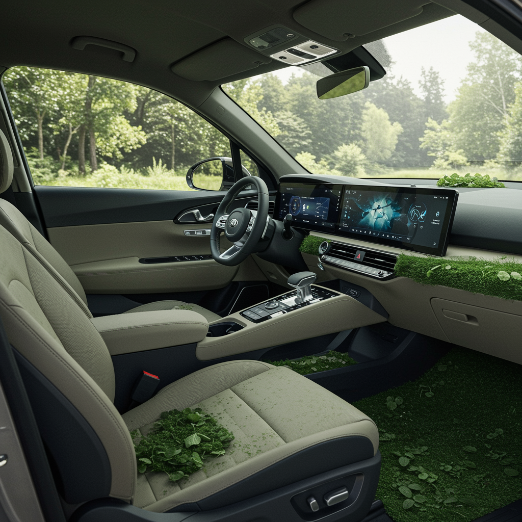 Imagine stepping into a futuristic zen sanctuary where cutting-edge technology meets the cozy embrace of nature. The AI-designed interior is inspired by the sleek contours and sophisticated elegance of the Kia Sportage 2023. Soft ambient lighting reflects off minimalistic surfaces, creating a serene glow. The luxurious seats evoke the comfort of being gently cradled, fashioned from eco-friendly materials that mimic the tactile sensitivity of human touch. Panoramic digital screens seamlessly blend into the fluid lines of the dash, offering not just control but an immersive storytelling experience through interactive AI art that responds to mood and weather. The inner cabin pulsates with subtle, soft green vegetation, bringing a breath of nature indoors, harmoniously intertwined with smart tech that anticipates every need. This space symbolizes a futuristic vision of adaptable elegance, a cocoon of tranquility amidst advanced engineering.