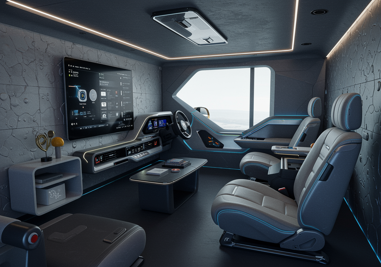 Imagine a futuristic living space that seamlessly blends the sleek, modern aesthetics of the 2024 Kia Sportage interior with an avant-garde AI-driven design. The room features ergonomic furniture with metallic accents and bold lines, reminiscent of a car's dashboard, while ambient lighting mimics the soft illumination of a vehicle's interior. The walls are textured with a digital interface that changes color and pattern based on mood, echoing the adaptable climate controls of the Sportage. A central console, resembling a car's infotainment system, acts as the brain of the space, managing everything from temperature to entertainment through voice command and gesture. Large windows provide a panoramic view, filtered by smart glass that automatically adjusts opacity, capturing both privacy and openness, like the perfect balance in a well-equipped automobile. Scalability and flexibility underscore the design, reflecting the spacious yet intimate feel of a thoughtfully crafted car interior, inviting inhabitants to experience a space as versatile as the journey itself.