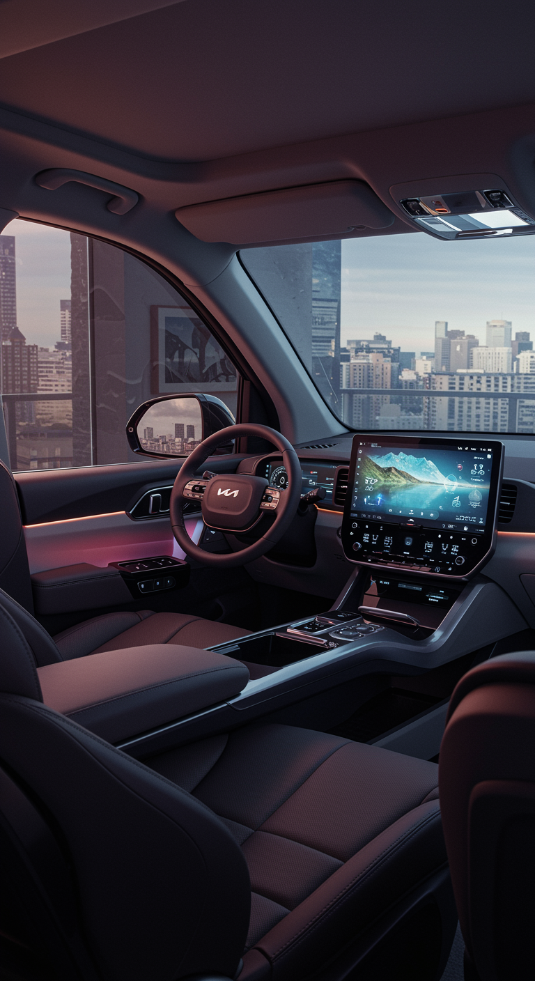 A futuristic living space seamlessly merges technology and comfort, inspired by the 2024 Kia Telluride interior. The room is bathed in ambient lighting that subtly shifts color, echoing the soft glow of a Telluride dashboard. Luxurious leather seating features intricate stitching reminiscent of the SUV's elegant design. The centerpiece is a sleek, curved digital hub that mirrors the infotainment system, projecting holographic displays of art and nature. A panoramic window offers a view of a bustling cityscape, blending the car's spirit of adventure with a sense of sophisticated urban living. Smart surfaces morph in function and style at a touch, capturing the innovative essence of AI-driven home design.