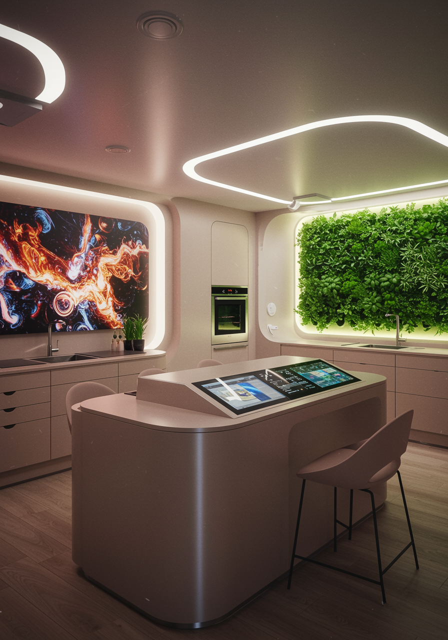 Envision a futuristic kitchen interior designed by AI, where sleek, curved surfaces blend seamlessly with organic textures; metallic countertops with integrated touchscreens contrast against walls adorned with digital art that changes with the ambiance; modular furniture transforms for various functions, while ambient lighting responds to the presence of people, adjusting hues to match the time of day; a smart ceiling with built-in sensors optimizes temperature and air quality, and a botanical wall composed of vertical herb gardens complements the artfully designed space, emphasizing the harmonious blend of technology and nature.
