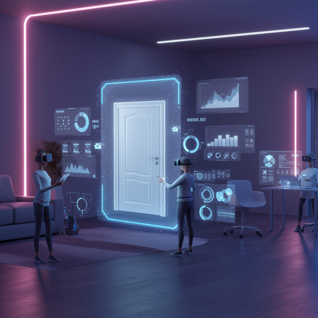 In a futuristic living space, a sleek, modern interior door is showcased as a digital hologram hovering in place, surrounded by floating data points and graphs representing labor costs and efficiency metrics. Around the hologram, a team of diverse AI avatars collaboratively discusses and analyzes the data using virtual reality tools. They are depicted in an ultra-modern digital workspace with minimalist furniture and walls that transform into interactive screens. The scene is bathed in ambient neon lighting, highlighting the seamless integration of technology into interior design, and symbolizes the evolution of cost analysis in practical implementations.
