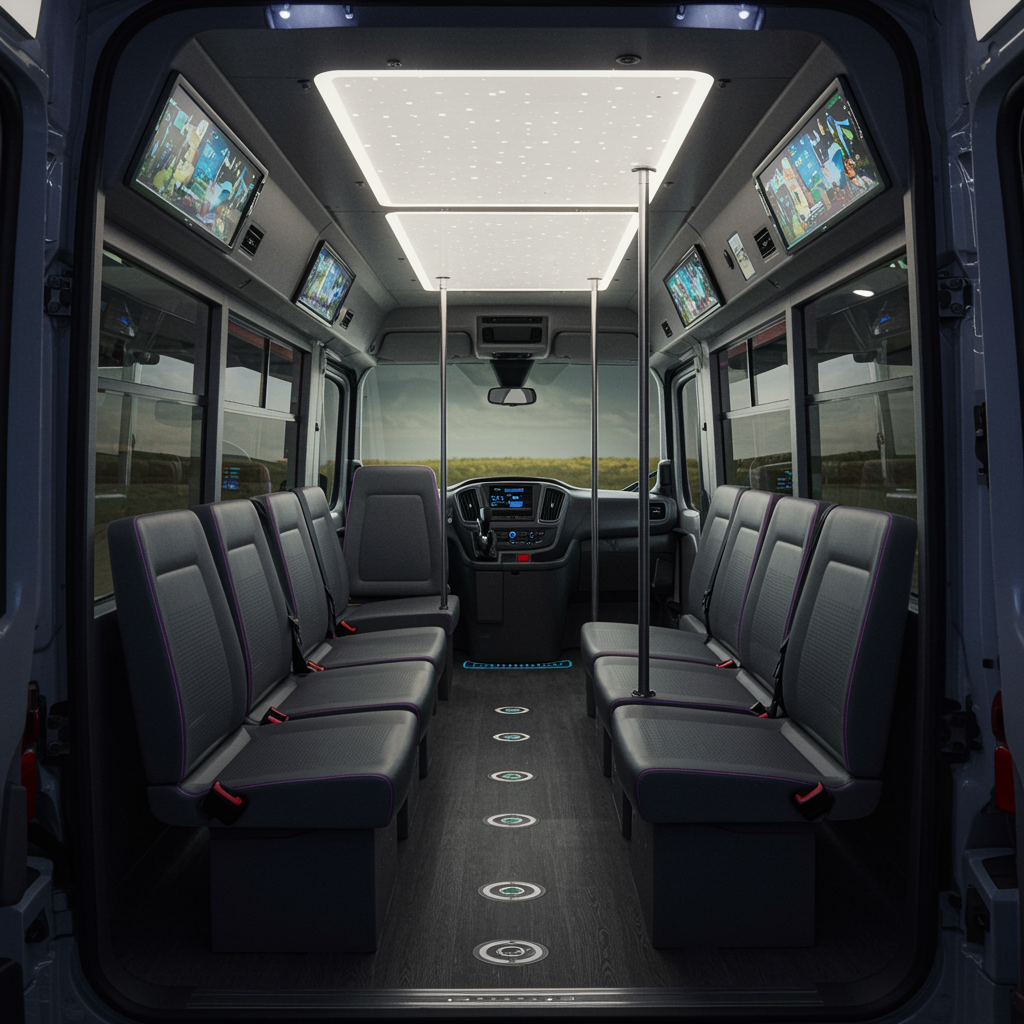 Imagine an AI-designed interior of a Ford Transit 15-passenger van, where smart technology meets ergonomic elegance. The space is reimagined with sleek modular seating that dynamically adjusts to passenger needs, integrated with ambient AI-controlled lighting that shifts colors based on moods. The walls feature interactive touchscreens, offering personalized entertainment and connectivity, while the ceiling is adorned with a translucent, energy-efficient panel that mimics natural daylight. The flooring contains embedded motion sensors to optimize space utilization and ensure safety, creating an inviting, futuristic transit experience that blends comfort with cutting-edge innovation.