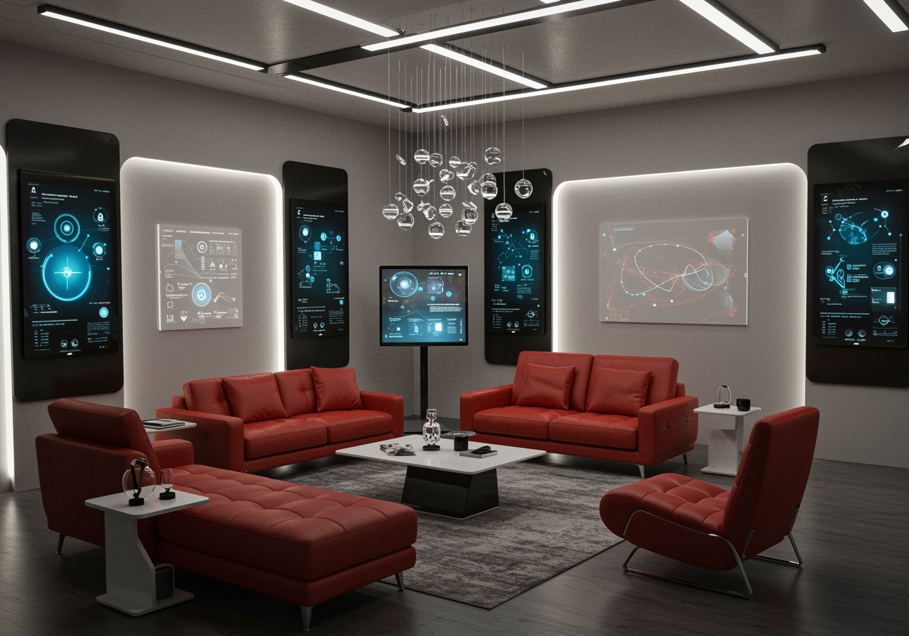 Imagine a futuristic living room that seamlessly blends luxury with cutting-edge technology, where the walls are adorned with sleek, holographic interfaces displaying customizable ambient moods. In the center, a sophisticated AI-driven seating arrangement exudes the opulent allure of Lexus red leather, enveloping occupants in warmth and elegance. Illuminated by soft, intelligent lighting that adjusts to personal preferences, the space is completed by a self-regulating climate system and an artfully suspended kinetic chandelier that dances gracefully with the play of light and shadow, transforming the room into a lavish sanctuary for innovation and relaxation.