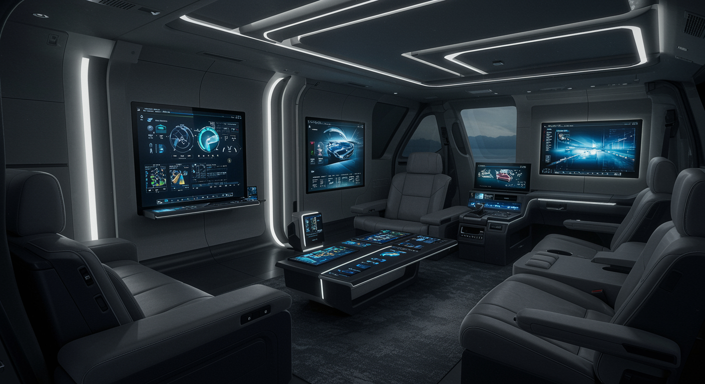 Imagine a futuristic living space seamlessly blending the luxury and sophistication of the Lexus RX 350 interior into home design. The scene features elegant leather seating reminiscent of the car's refined upholstery, with ambient lighting casting a serene glow, echoing the vehicle's advanced technology. The walls mimic the sleek curves and brushed metal accents of the car's console, while large digital screens display customizable environments, transforming the space at will. Glass panels offer a panoramic view, akin to the car’s moonroof, merging indoor comfort with the beauty of the outside world, creating an immersive experience that harmonizes cutting-edge technology with opulent design.