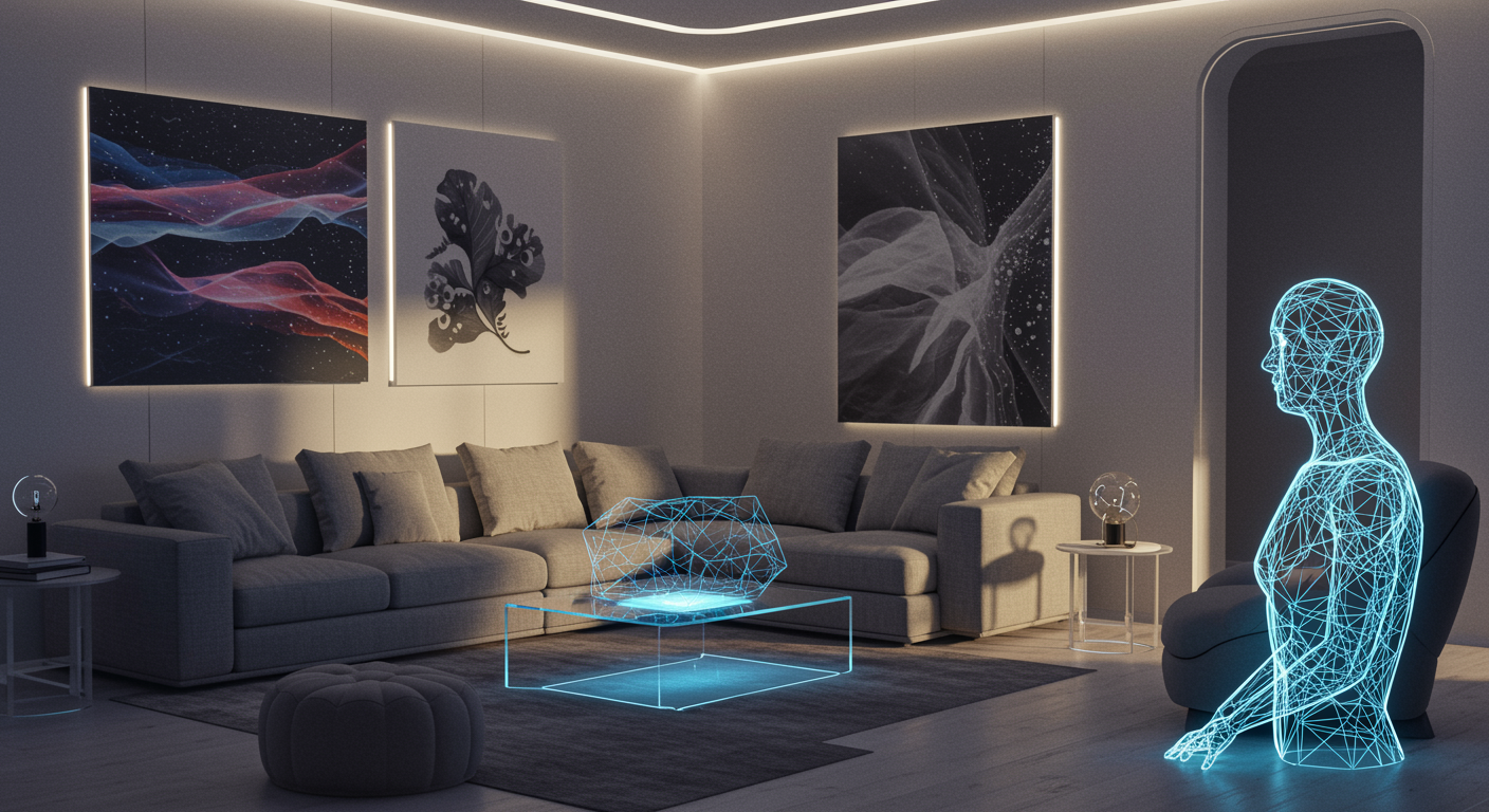 Imagine a futuristic living room interior where AI seamlessly integrates with minimalist design, featuring sleek furniture with smart fabric that changes color based on mood, a transparent coffee table that doubles as a holographic display, and walls adorned with dynamic digital art pieces curated and adapted by AI to reflect the owner's preferences. The room is softly illuminated by intelligent lighting that mimics natural sunlight, and a virtual assistant manifests itself as an intricate light sculpture, providing gentle ambiance and responsive interaction.