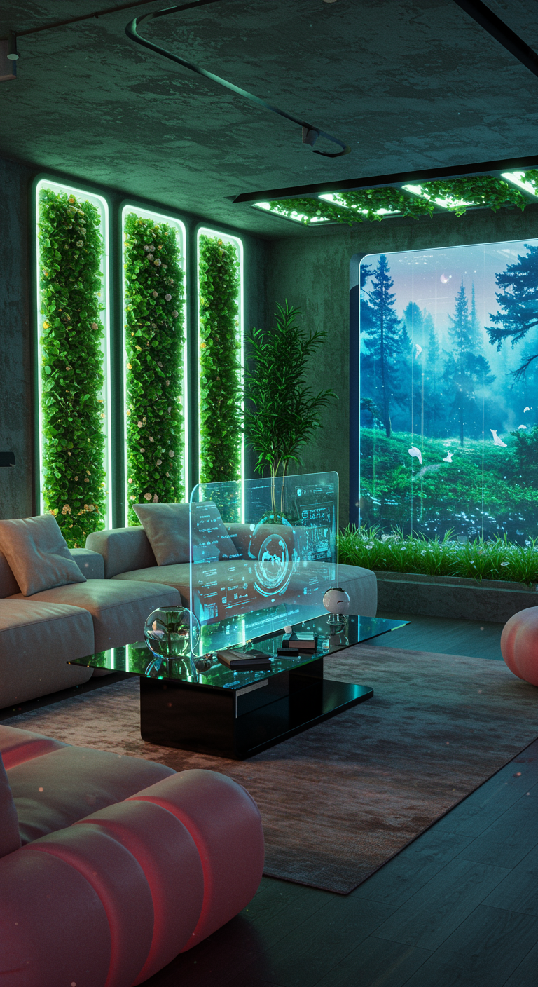 Envision a futuristic living room in 2024 where AI and nature seamlessly blend, showcasing a harmonious fusion of technology and organic elements. The space features dynamically adaptive furniture that changes shape and color based on the homeowner's mood, while walls are lined with intelligent, bioluminescent plant panels gently illuminating the room with an ethereal glow. A floor-to-ceiling holographic window displays personalized landscapes, shifting from serene forests in the morning to vibrant cityscapes by night. In the center, an AI-powered coffee table doubles as an interactive hub, learning and adjusting to personal preferences, while surrounding transparent OLED screens display customizable art, bringing a touch of digital elegance to this cutting-edge, yet tranquil living space.