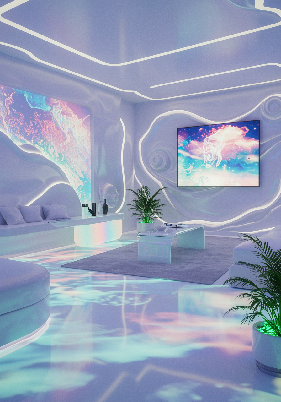 Imagine a futuristic living space that embodies the concept of lucid dreaming, where the boundaries between reality and imagination blur. The room is bathed in soft, ethereal lighting that changes color with a person’s mood. Walls are fluid, adorned with digital murals that shift and pulse subtly to create a sense of movement and life. Furniture appears to be floating, sleekly designed with transparent and opalescent materials that subtly reflect light, creating a dreamlike quality. An AI-driven interactive wall acts as both an art piece and a functional interface, displaying abstract patterns and responding to gestures and spoken commands. The floor has an iridescent sheen, with patterns reminiscent of flowing water or clouds, encouraging mindful exploration and tranquility. Houseplants infused with bioluminescent properties gently glow, harmonizing with the ambient lighting. This lucid interior is not just a room but an experiential space designed to inspire creativity and serenity, inviting inhabitants to journey beyond the ordinary.