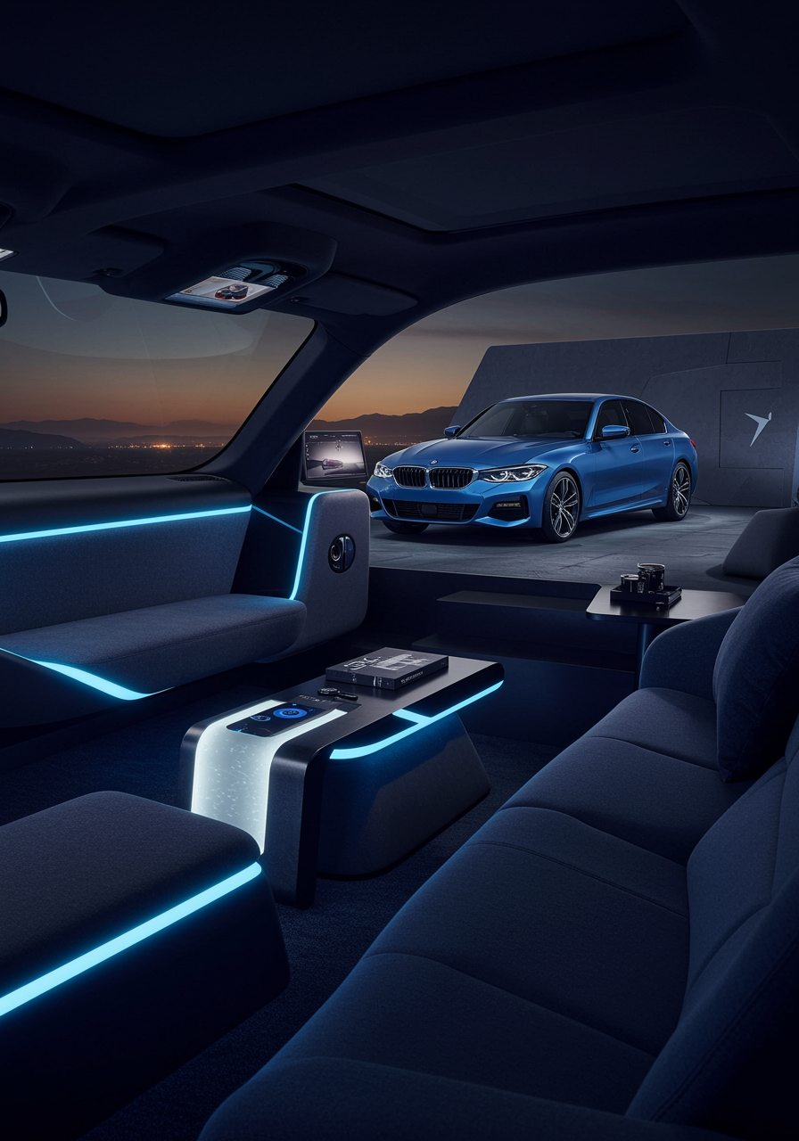 Imagine stepping into a futuristic living space designed by an AI that seamlessly embodies the essence of luxury and performance. The interior echoes the sophisticated spirit of the BMW M340i, where every element reflects sleek aerodynamic lines and dynamic fluidity. Organic materials blend with high-tech fabrics in a color palette inspired by the deep blues and rich blacks of the midnight sky, enhanced by ambient lighting akin to a car's dashboard glow. Furniture pieces mimic the curvature of the car's design, with plush seating that resembles sporty bucket seats, while minimalist high-gloss surfaces evoke the car's streamlined architecture. Technological interfaces are smoothly integrated into the environment, offering an intuitive experience that harmonizes human touch and digital efficiency. The space exudes a sense of movement even at rest, a tribute to the exhilarating power and refined elegance of the M340i, crafted for those who appreciate the intersection of advanced technology and timeless luxury.