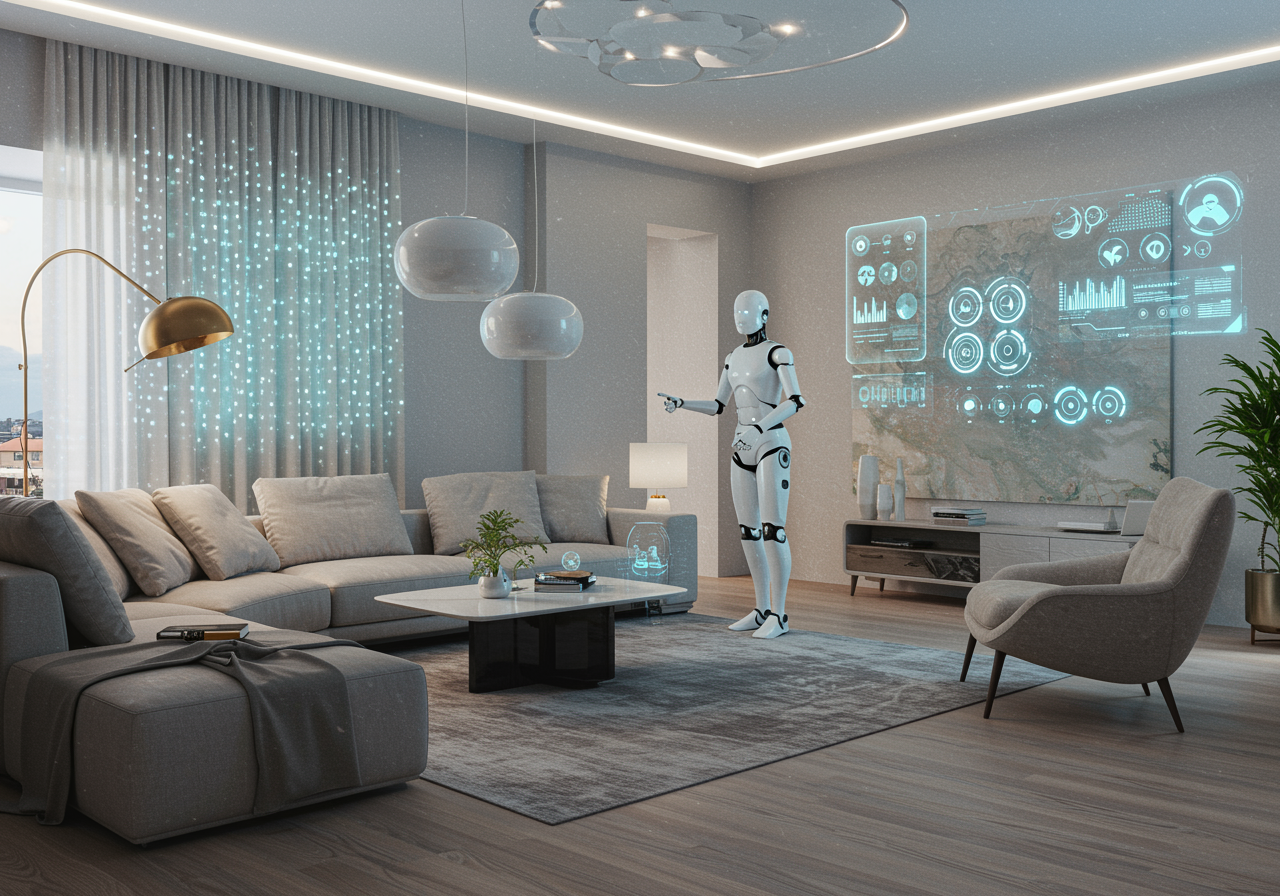 A futuristic living room seamlessly blends organic and digital elements, showcasing intelligent furniture with self-adjusting features, responsive LED walls that adapt to mood, and a holographic interface for personalized environmental controls. The space is designed by an AI, blending nature-inspired textures with sleek, minimalistic lines to create a harmonious sanctuary. In the center, a robotic assistant offers real-time design adjustments, symbolizing the evolution of mainterior designer jobs where human creativity meets advanced technology.