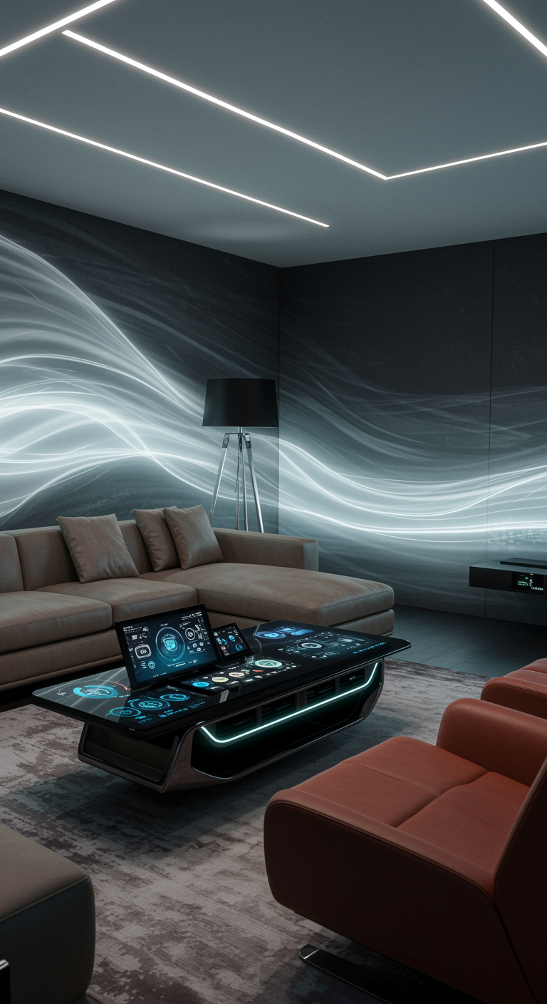 Envision a futuristic living room seamlessly blending automotive and interior design, where the elegance of a Mazda CX-5 interior is transformed into a luxurious home setting. Picture a sleek dashboard-inspired coffee table with digital touch interfaces, reclining leather armchairs mimicking the car's plush seats, and ambient LED lighting echoing the car's sophisticated illumination. The walls are adorned with abstract, flowing patterns reminiscent of aerodynamics, incorporating advanced AI technology subtly integrated throughout the space for a highly intuitive and immersive experience. This room immerses inhabitants in an ambiance where cutting-edge technology and automotive sophistication converge, creating a serene yet technologically advanced atmosphere.