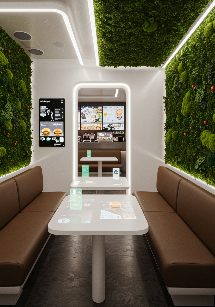 Imagine a futuristic McDonald's interior reimagined by AI, where sleek, ultra-modern furniture blends with playful, minimalistic elements. The space features interactive digital walls that display customizable decor themes, adapting to the mood and time of day. Soft, ambient lighting changes dynamically to enhance the atmosphere, while holographic menus float above tables made of a bioluminescent material. The design incorporates sustainable, organic textures in unexpected ways, such as moss walls that double as digital art canvases and seating that appears to hover with magnetic levitation technology.