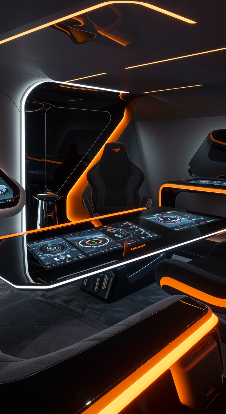 A futuristic living room seamlessly blending cutting-edge AI technology with the sleek elegance of a McLaren car interior; smooth, aerodynamic lines flow across the room, with a minimalist color palette of charcoal grey, jet black, and vibrant McLaren orange; innovative smart surfaces transform into dynamic display panels, while AI-driven lighting casts dramatic shadows, mimicking the glow of a high-performance dashboard; plush racing-style chairs flank a central table shaped like an aerodynamic spoiler, exuding both luxury and speed; the overall ambiance reflects a harmonious fusion of high-tech sophistication and high-speed automotive artistry.