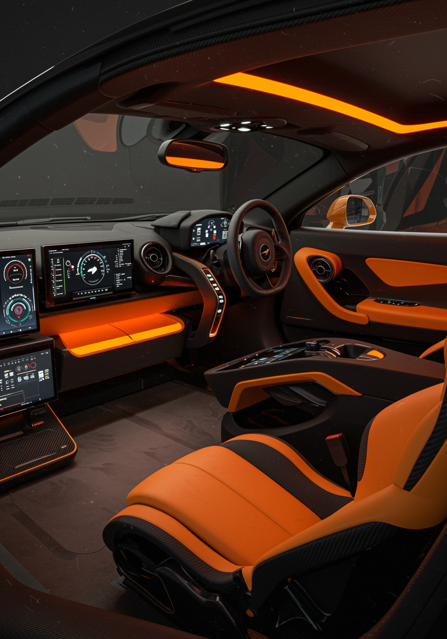 Envision an ultramodern living room where cutting-edge artificial intelligence intertwines with the luxurious essence of the McLaren Senna's interior; the space features sleek, aerodynamic furniture inspired by the car's contoured carbon fiber seats, infused with digital interfaces seamlessly integrated into every surface; elements of vibrant orange and carbon black dominate the palette, accented by ambient lighting that mimics the car’s dynamic performance; a central AI hub shaped like a futuristic steering column offers intuitive control over the room's adaptable aesthetics, creating an atmosphere that echoes high-speed elegance and technological brilliance.
