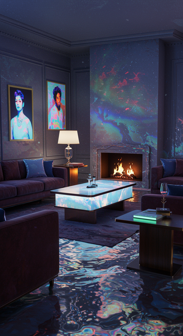 Imagine stepping into an AI-reimagined 1980s luxury living room inspired by the infamous Menendez brothers' style, where nostalgia meets futuristic elegance. The room features vintage mahogany furniture with glossy, holographic finishes that shift colors under soft ambient lighting. On the walls, hyper-realistic digital art portraits dynamically change, capturing emotions in real-time. A centerpiece table crafted from AI-generated opal simulates natural geological formations while displaying personalized transitions of light patterns. Plush velvet sofas in rich, deep hues pair with geometric-patterned throw pillows made of smart fabric, adapting textures for ultimate comfort. An intelligent, suspended fireplace flickers serenely, casting algorithmically-created shadows across the room. The floor, an intricate mosaic of liquid-metal-like tiles, flows gently like mercury, responding to footsteps with rippling effects. Each element effortlessly tells a story of opulence intertwined with cutting-edge technology, enveloping the space in an atmosphere both timeless and advanced.