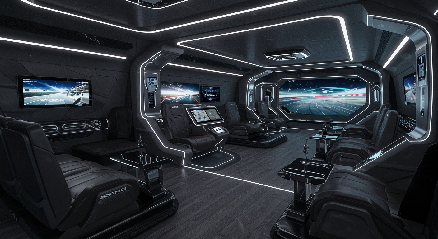 Imagine stepping into a futuristic lounge that seamlessly merges luxury automotive design with cutting-edge AI technology. The space is infused with the sleek, aerodynamic curves and metallic finishes reminiscent of a Mercedes AMG interior, featuring opulent leather seating and polished carbon fiber accents. Ambient lighting pulsates gently, guided by an AI system that adapts to your mood, while voice-activated interfaces and augmented reality panels create an effortless user experience. The floor's texture mimics that of a high-performance tire, and the walls are adorned with interactive touchscreens that display dynamic drive-inspired art, all tied together by a sense of speed and innovation that defies traditional interior design norms.