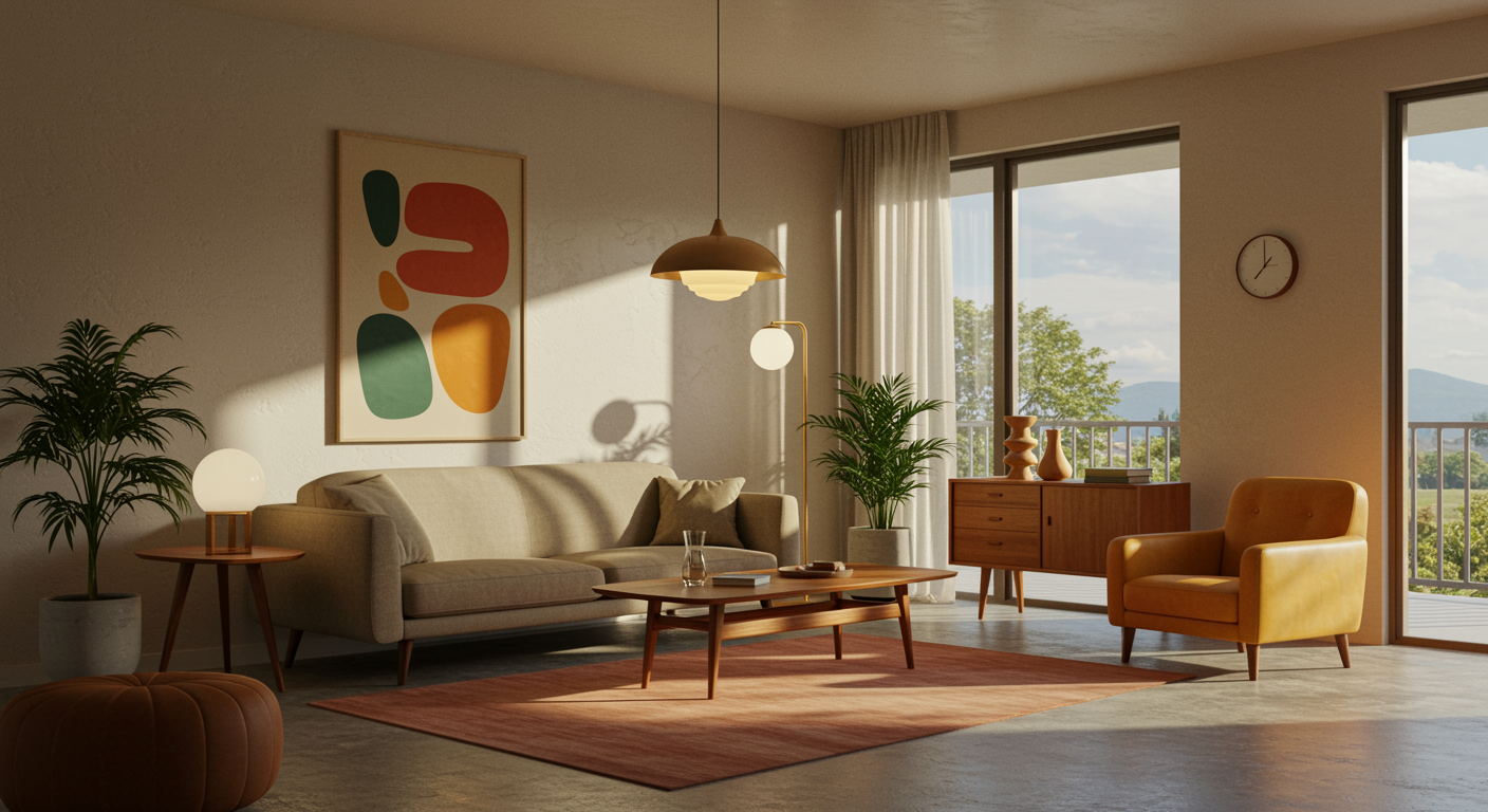 Imagine a serene mid-century modern living room meticulously crafted by an advanced AI, where retro-futuristic furniture pieces blend seamlessly with organic shapes and clean lines. The space is bathed in warm, natural light filtering through floor-to-ceiling windows, showcasing a harmonious palette of earthy tones and vibrant accents. A plush, curved sofa is paired with an elegant, low-slung teak coffee table, while a geometric area rug adds depth to the polished concrete floor. A state-of-the-art AI-generated art piece adorns the wall, merging bold colors with abstract forms inspired by the 1950s. Lush indoor plants strategically placed invoke a sense of nature’s presence, while intelligent lighting subtly adapts to the time of day, creating an atmosphere that is both nostalgic and forward-thinking.