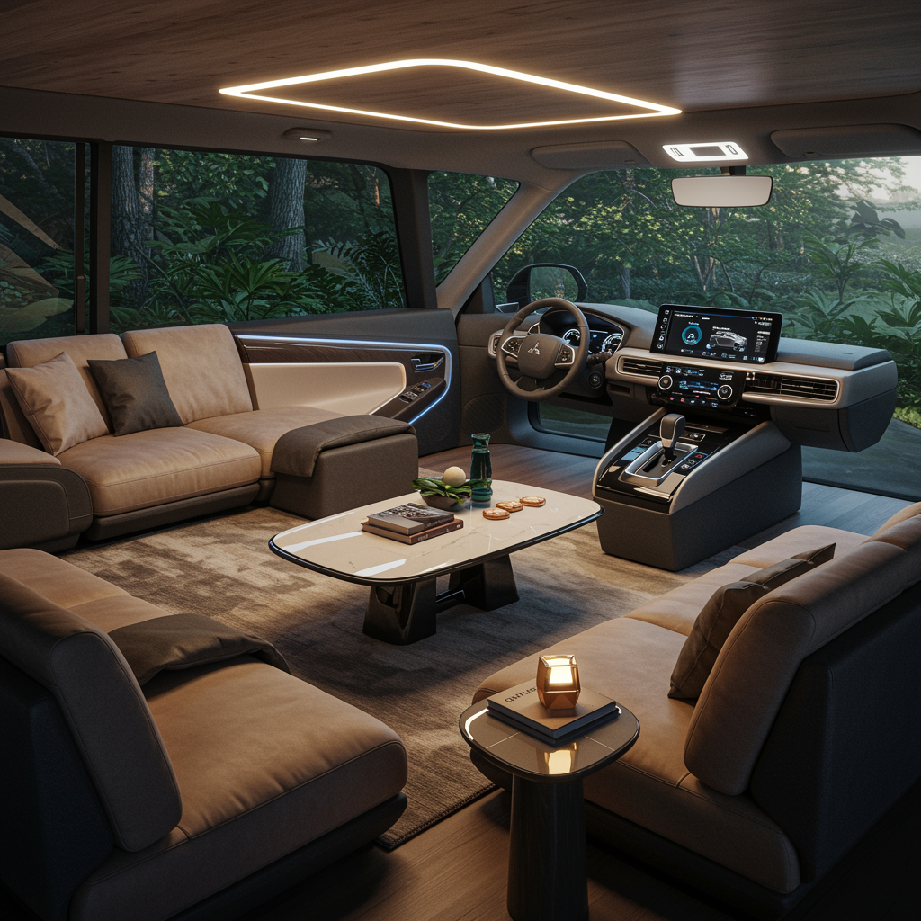 Imagine a futuristic living room seamlessly blending the aesthetic of the 2024 Mitsubishi Outlander interior with cutting-edge AI interior design. The space is illuminated by ambient lighting reminiscent of the car's sleek dashboard interface, casting soft glows on modernistic furniture crafted from materials mirroring the Outlander's premium upholstery. A central AI system, inspired by the vehicle’s intuitive tech, seamlessly adjusts the environment's climate, lighting, and sound to the occupant's preferences. The room's layout mimics the spacious ergonomic design of the car, featuring modular seating for dynamic spatial organization and a smart infotainment hub resembling the sophisticated control panel of the Outlander, all set against a backdrop of nature, blurring the lines between automotive innovation and contemporary habitat.