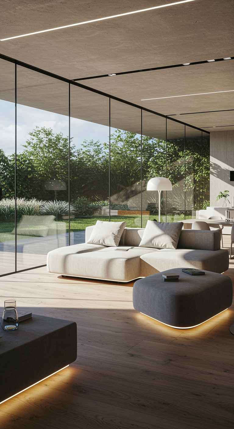 In a futuristic oasis of tranquility, the modern home interior unfolds as a seamless blend of elegance and technology; sunlight filters through smart glass walls casting dynamic patterns across a minimalist open-plan living area, where sleek modular furniture adapts to human presence like organic sculptures, and soft ambient lighting changes to suit the mood, accentuating the interplay between natural textures and high-tech surfaces; a virtual assistant, subtly integrated, orchestrates the ambiance in concert with nature, creating a harmonious sanctuary where every element embodies sophisticated simplicity and cutting-edge innovation.