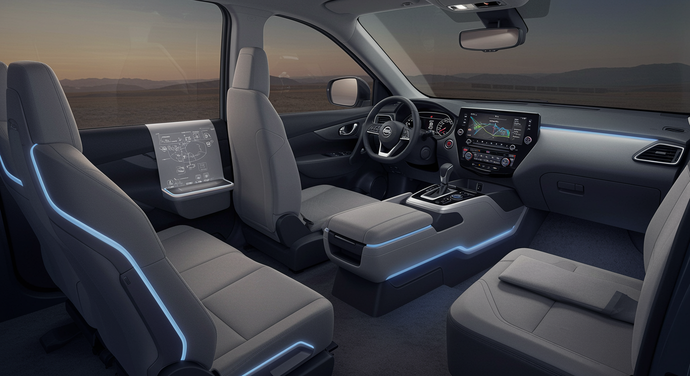 Envision a futuristic living space seamlessly blending AI technology with the sleek sophistication of the Nissan Rogue 2023 interior. Picture a room where digital assistants and smart systems are integrated into the minimalist design, featuring ergonomic seating inspired by car seats and an ambient lighting scheme reminiscent of high-tech dashboard glows. Clean lines and high-tech materials dominate, with interactive touch surfaces that mimic the SUV’s infotainment system. The space is a harmonious blend of automotive elegance and digital innovation, where every element serves both aesthetic beauty and practical function, offering a sanctuary that is as intelligent as it is inviting.
