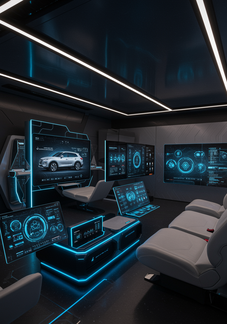 A futuristic AI-driven interior design seamlessly blends the sleek aesthetics of the 2024 Nissan Rogue with a high-tech home lounge. Envision an open, spacious room bathed in ambient lighting that mirrors the car's advanced dashboard display. The ergonomic seating mimics the Rogue's contoured, supportive seats, while multimedia walls replicate the vehicle's innovative interface, enabling seamless connectivity and control over the room's smart devices. An array of touch-sensitive surfaces and holographic displays decorate the space, echoing the car's sophisticated technology, creating an immersive environment that feels both luxurious and avant-garde.