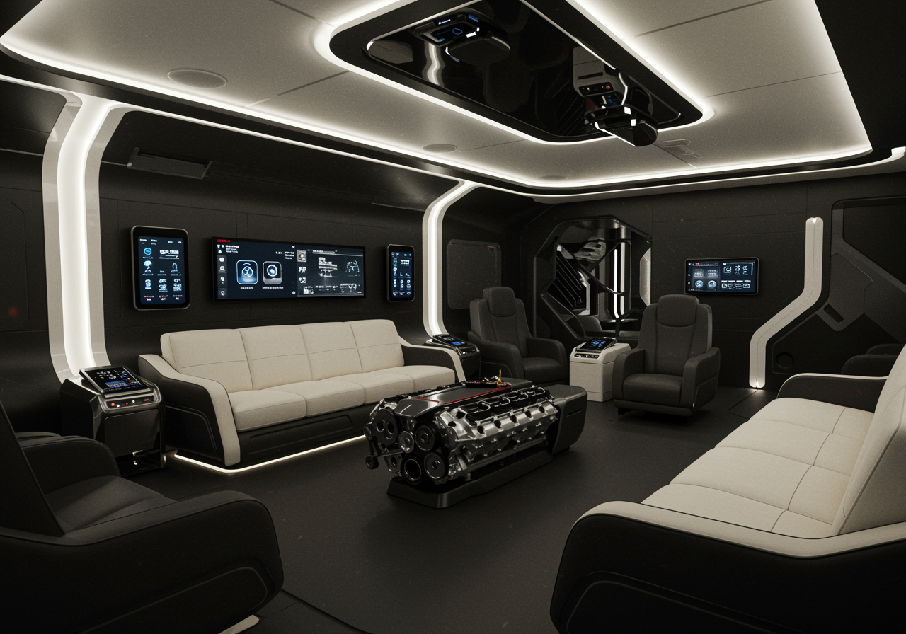 Imagine a futuristic lounge where the sleek curves and dynamic lines of a Nissan Z interior inspire every element. The space is a harmonious blend of high-tech luxury and automotive elegance, featuring plush seating crafted from materials reminiscent of leather car seats, illuminated by ambient LED lighting that mimics dashboard displays. A central coffee table, designed to resemble an engine block, sits prominently under a ceiling that evokes the aerodynamic flow of wind through a coupe's silhouette. Control panels on the walls, inspired by a car's sleek digital interfaces, allow inhabitants to customize lighting, temperature, and media with a touch. The room's color palette mirrors the rich shades of car interiors, with deep blacks, creamy whites, and metallic accents, embodying the seamless integration of automotive design and AI-driven home aesthetics.