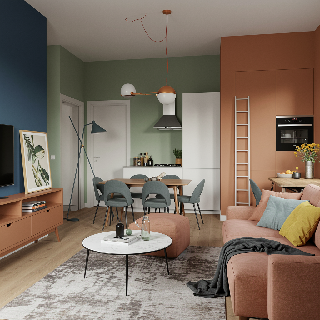 Imagine stepping into a contemporary apartment where the walls are alive with a symphony of colors, each hue selected by an AI to perfectly balance the ambiance; the living room boasts an elegant blend of warm terracotta and muted sage green, exuding tranquility and sophistication, while the kitchen is invigorated with a vibrant splash of deep navy blue complemented by crisp white cabinets, creating a striking contrast; in the bedroom, the AI has chosen a serene shade of lavender-gray to encourage restfulness, subtly highlighted by pops of golden yellow in decor accents; throughout the space, the AI's choice of popular paint colors create a harmonious yet dynamic environment, where technology meets artistry in every brushstroke, inviting guests into a realm of innovation and timeless elegance.