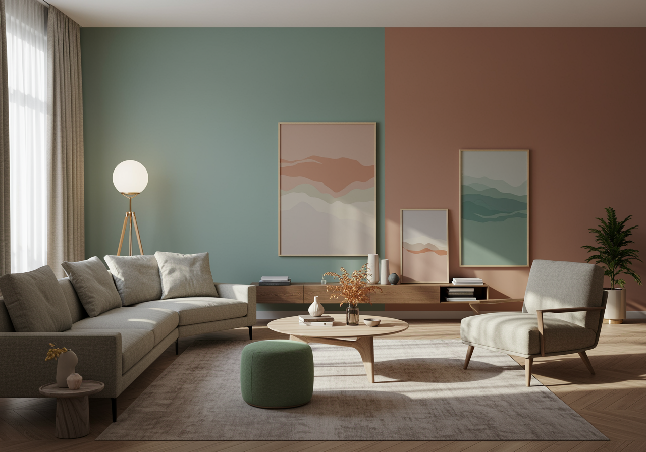 A sunlit, modern living room seamlessly blending AI innovations with human artistic flair, showcasing a serene haven where walls are adorned with the trending paint colors of 2024—a harmonious palette of ethereal misty blues, sophisticated muted terracotta, and gentle green sages. The room features sleek, AI-designed furniture with minimalist lines and smart textiles that subtly change shades to complement the shifting light, while an interactive digital art installation reacts to ambient sounds, creating a dynamic interplay of color and design.
