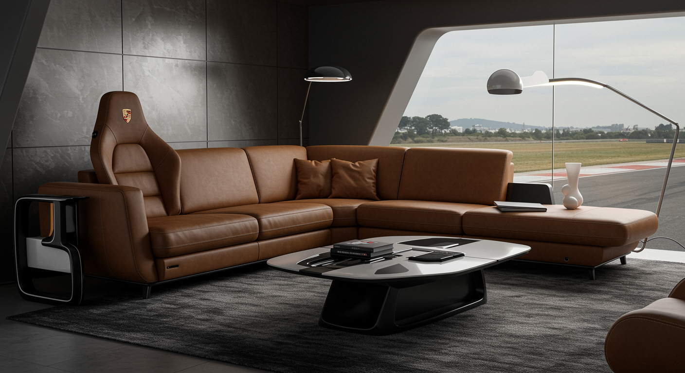 Imagine an avant-garde living room inspired by the sleek luxury of a Porsche 911 interior, where every element echoes the sophistication and precision of the iconic car. The focal point is a minimalist couch upholstered in leather identical to that of a Porsche seat, with tonal stitching that exudes craftsmanship. The walls are adorned with metallic finishes reminiscent of a streamlined dashboard, while floor-to-ceiling windows evoke the feel of a panoramic sunroof, allowing natural light to flood the space. A coffee table, shaped like the car's steering wheel, sits on a plush carpet that mimics the texture of the race-track, tying together an ambiance that seamlessly blends automotive elegance with futuristic AI-enhanced design solutions.
