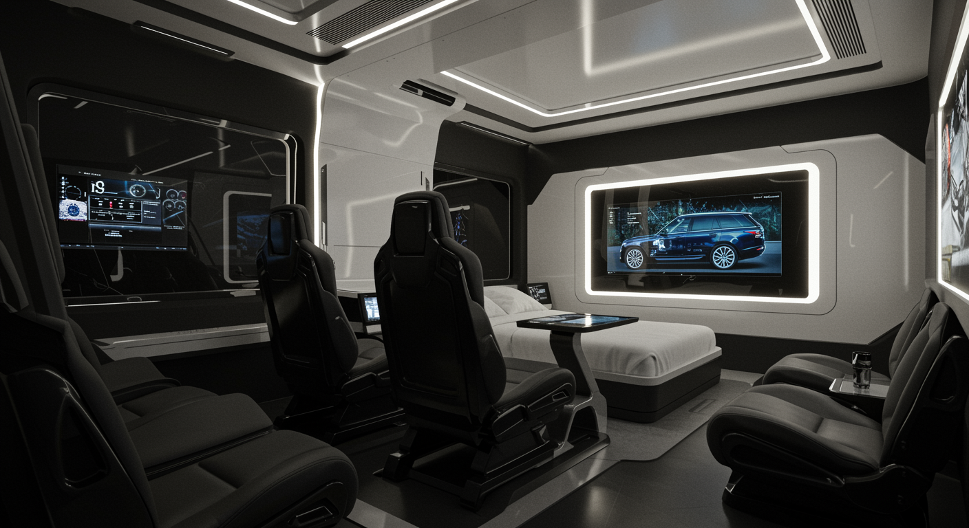 Envision a futuristic interior where sleek, minimalistic lines meet luxurious comfort, inspired by the sophisticated elegance of the Range Rover Sport. The space blends cutting-edge AI technology with the opulence of a high-end vehicle, featuring seats with fine leather upholstery and state-of-the-art interactive displays integrated seamlessly into the walls. Ambient lighting mimics the soft glow of a car's dashboard at night, while dynamic textures and polished surfaces evoke the tactile sensation of a high-speed journey. This AI-designed room encapsulates the essence of performance-driven luxury, inviting you to experience a world where automotive design seamlessly intersects with modern living spaces.