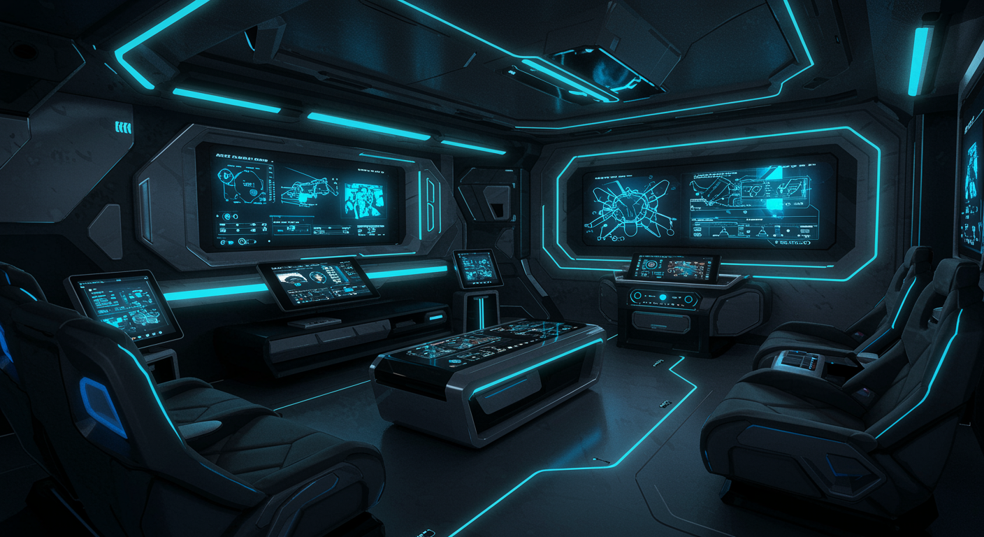 Create an image of a futuristic AI-designed living room inspired by the Shelby F150 Super Snake interior, featuring sleek metallic surfaces, high-performance aesthetic elements, and a harmonious blend of luxury automotive styling with cutting-edge smart technology. The room incorporates racing-inspired curves, carbon fiber textures, and vibrant blue LED lighting accents, seamlessly integrating digital interfaces on minimalist furniture. The space exudes the essence of speed and innovation, with plush seating mimicking luxury car seats, against a backdrop of panoramic digital displays offering customizable ambient environments.