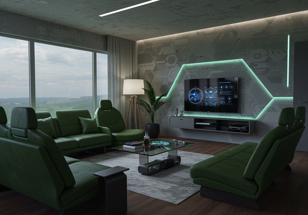 Imagine a futuristic living room designed by an AI with inspiration drawn from the sleek interiors of a Subaru car. The space is a harmonious blend of technology and comfort, featuring ergonomic seating that mimics the supportive design of Subaru's car seats, textured in a mix of leather and eco-friendly materials. The dashboard aesthetic is translated into a minimalist, high-tech media center with ambient LED lighting that shifts colors based on the mood of the room. A coffee table with a transparent surface houses an interactive digital interface for smart home controls, echoing the intuitive control panel found in a vehicle. The walls are adorned with patterns reminiscent of Subaru's signature all-wheel drive technology, merging geometric precision with organic flow. Large windows with AI-controlled smart glass allow for adjustable opacity, echoing the tinted windows of a premium car, creating a sanctuary that fuses the essence of automotive design with cutting-edge home interiors.