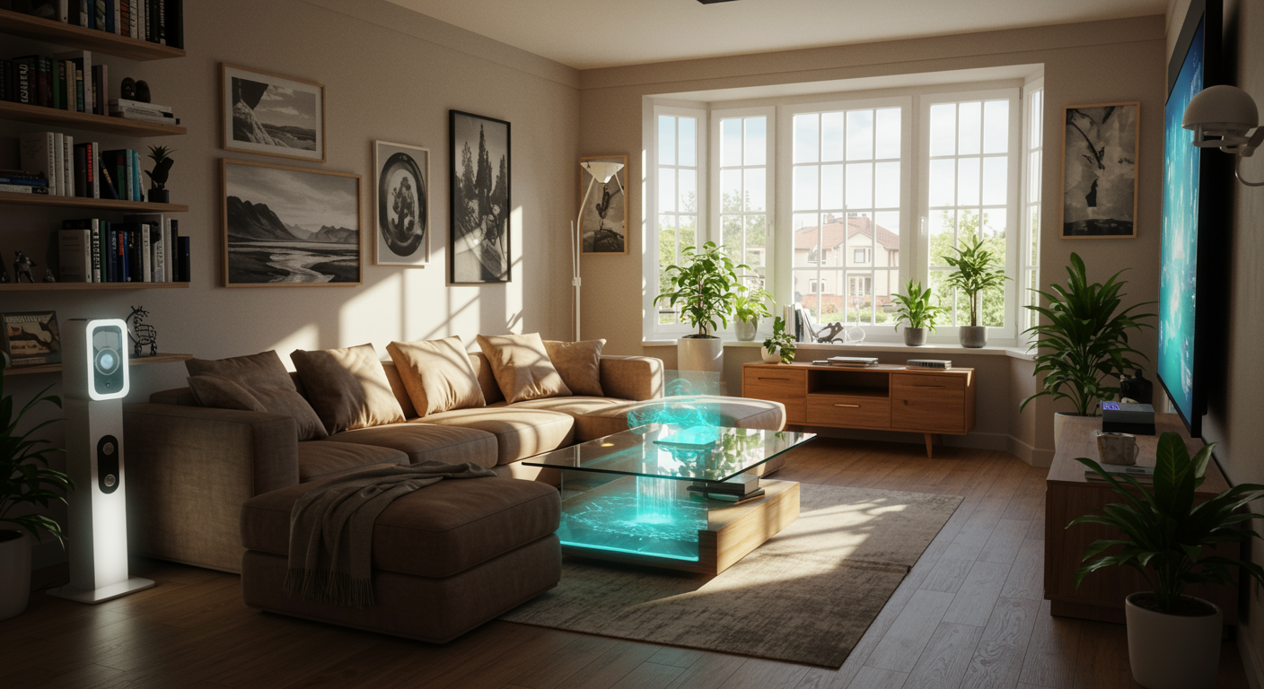 Imagine a cozy suburban living room reimagined by advanced AI: sunlight streams through large bay windows, casting intricate geometric patterns on a plush, earth-toned sectional sofa. The walls are adorned with smart art frames that change imagery based on mood, and the central coffee table is a seamless blend of glass and sustainable wood, its surface displaying a serene digital waterfall. Shelves of AI-curated books frame the entertainment console, where a holographic projector creates an immersive visual experience. Vibrant houseplants, cared for by autonomous robotic nurturers, lend natural beauty, while ambient lighting adjusts throughout the day to mimic the gentle rise and fall of the sun.