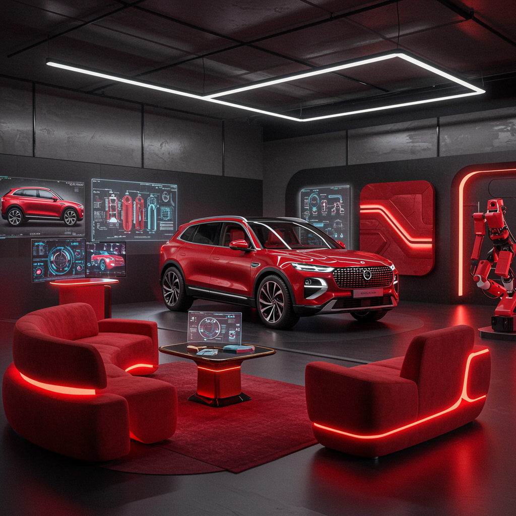 In an ultramodern studio where technology meets artistry, an AI-designed SUV sits majestically at the heart of the space, showcasing its opulent red interior. The sleek lines of the vehicle contrast with a futuristic backdrop of digital displays and holographic mood boards, highlighting the fusion of comfort and cutting-edge design. Textures of scarlet velvet and shimmering ruby leather interplay with ambient lighting, casting a warm, inviting glow. Sleek AI-driven furniture, with adaptive shapes and responsive surfaces, complements the car's dynamic design, while robotic decor elements subtly animate with graceful precision, creating a harmonious environment where innovation and luxury seamlessly intertwine.