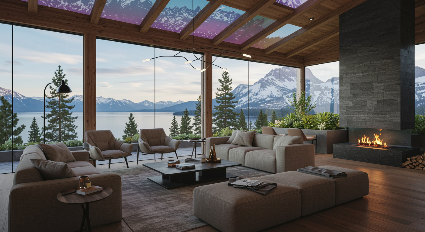 A futuristic AI-designed Tahoe interior where nature meets technology, featuring a spacious living room with large panoramic windows overlooking a serene lake, walls made of interactive smart-glass displaying shifting digital art landscapes of the Sierra Nevada, furniture crafted from sustainable materials with embedded AI that adapts to guests' comfort levels, a digitally curated fireplace that changes ambiance based on emotional AI feedback, and an organic rooftop garden with intelligent lighting panels that mimic the natural cycles of sunlight, all harmoniously blending rustic charm with cutting-edge innovation.