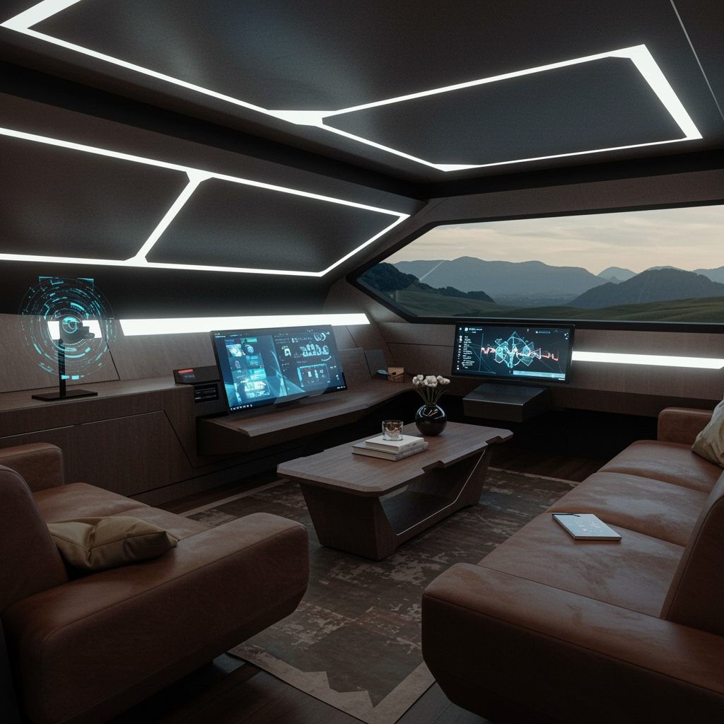 A futuristic living space blending the sleek, angular lines of the Tesla Cybertruck's interior features with cozy, AI-enhanced home comforts; imagine walls made of ultra-durable, matte titanium with embedded LED lighting panels mimicking the Cybertruck's dashboard, autonomous furniture that adapts to your mood, voice-activated climate control hidden within seamless metallic textures, and panoramic smart windows offering holographic displays of your digital life, all designed to evoke a sense of rugged luxury and cutting-edge innovation in a harmonious blend of technology and comfort.