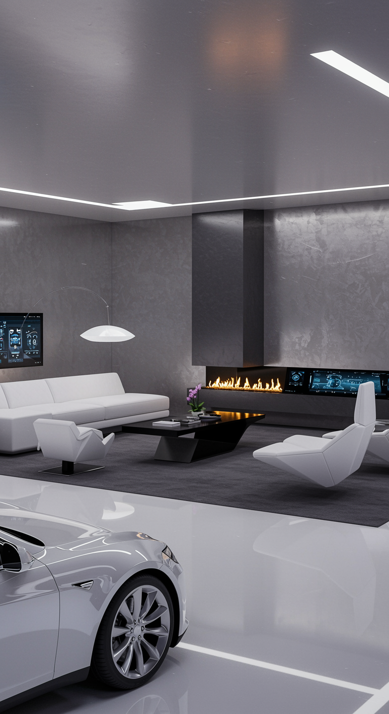 Imagine an ultramodern living room designed by AI with sleek lines and futuristic elegance, seamlessly merging the luxurious aesthetics of a Tesla Model S interior. The room features cutting-edge materials with a high-gloss white floor mimicking the car's pristine finish, and walls glisten with metallic sheen reminiscent of the vehicle’s dashboard. Floating geometric furniture mirrors the car's ergonomic seats, while ambient lighting shifts gently like the car’s interior illuminations. A digital fireplace at the heart of the room echoes the minimalistic infotainment center, with interactive screens embedded into surfaces for a fully integrated, smart environment. The space feels as if the Tesla has been transformed into a livable space, evoking luxury, technology, and comfort.