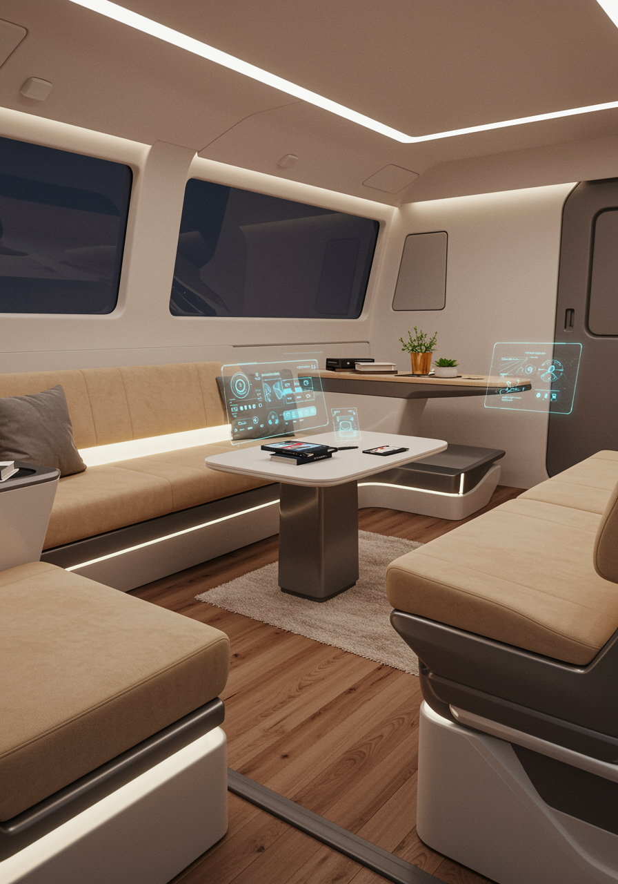 Imagine stepping into a futuristic reimagining of a cozy living space seamlessly blending cutting-edge technology with the elegant design philosophy of a Toyota bZ4X interior, where sleek surfaces and ambient illumination flow into a minimalist, open-concept layout, featuring aerodynamic furniture that mirrors the crisp contours and advanced materials of the vehicle's cabin, while soft, natural tones and textural contrasts evoke a sense of warm sophistication, and holographic interfaces subtly integrate within the decor, offering adaptive lighting and climate control to enhance comfort and efficiency, immersing you in a harmonious environment that intuitively responds to your lifestyle needs.