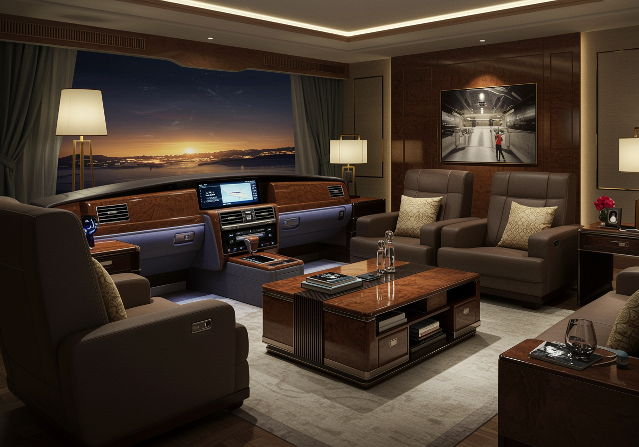Envision a luxurious living room designed by AI, seamlessly integrating the opulence of a Toyota Century interior. Rich leather armchairs mimic the car's plush seating, accented with intricate wood paneling that mirrors the vehicle's elegant dashboard. Ambient lighting, inspired by the Century's ambient cabin glow, casts a soft, inviting aura over the space. A central coffee table reflects the sleek design of the car's console, complete with integrated technology that blends seamlessly with the decor. The room exudes a harmony of modernity and tradition, embodying the sophistication and attention to detail synonymous with the Toyota Century experience.